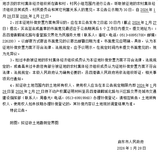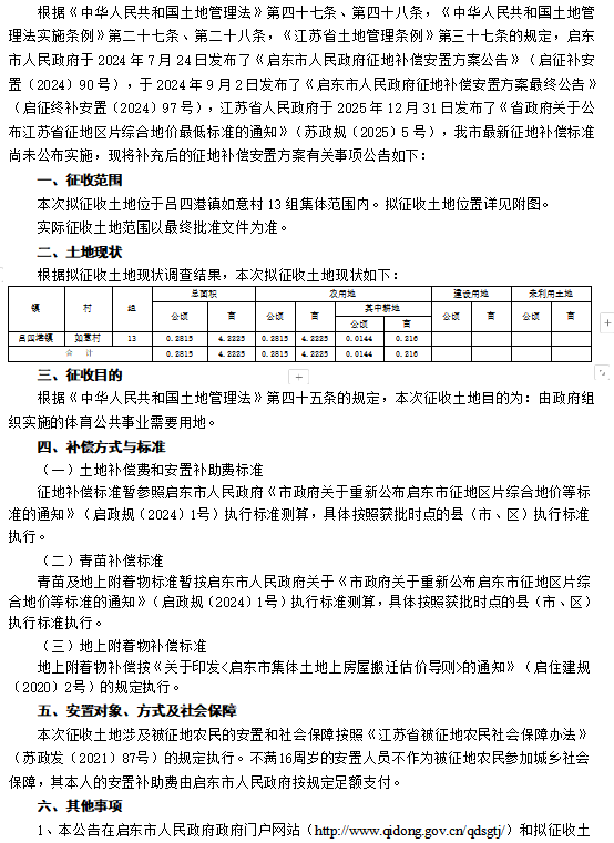 启东市人民政府征地补偿安置方案补充公告 启征补安置补告【2026】012号