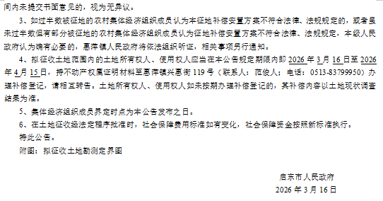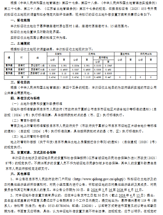 启东市人民政府征地补偿安置方案公告 启征补安置【2026】008号