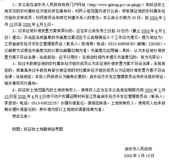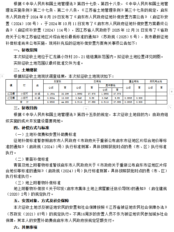 启东市人民政府征地补偿安置方案补充公告 启征补安置补告【2026】026号