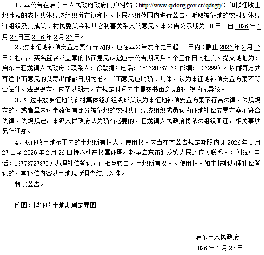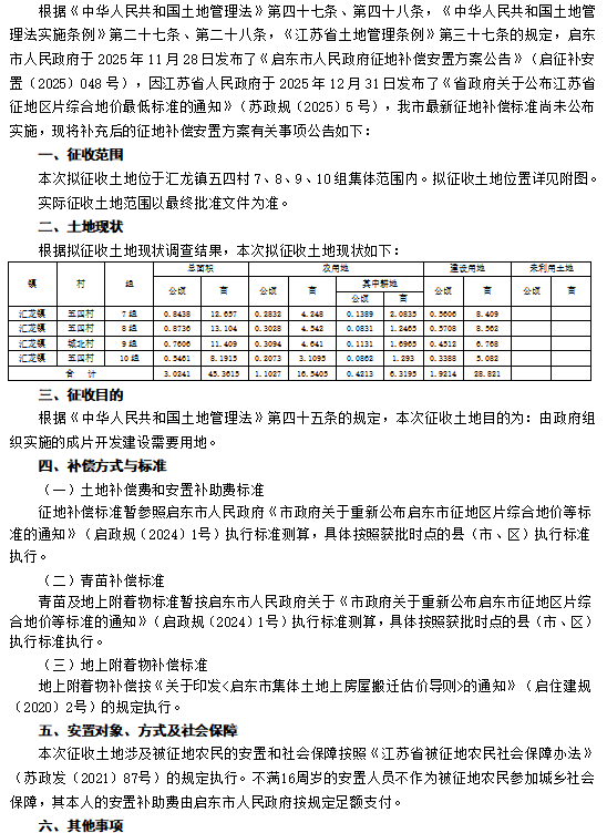 启东市人民政府征地补偿安置方案补充公告 启征补安置补告【2026】004号