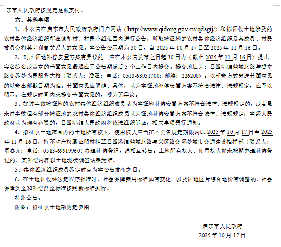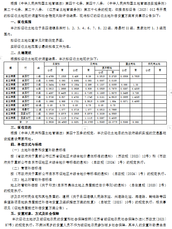 启东市人民政府征地补偿安置方案公告 启征补安置【2025】043号