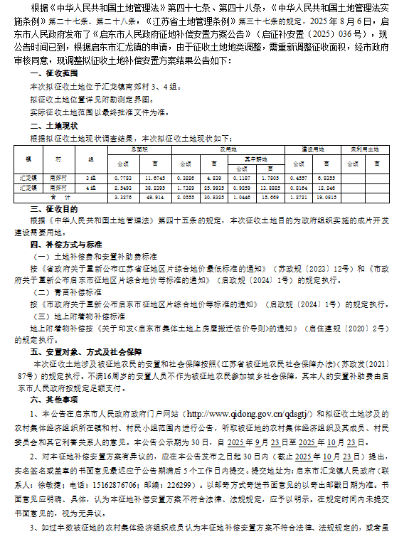 启东市人民政府征地补偿安置方案最终公告 启征终补安置[2025]48号