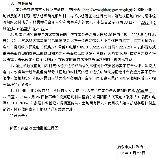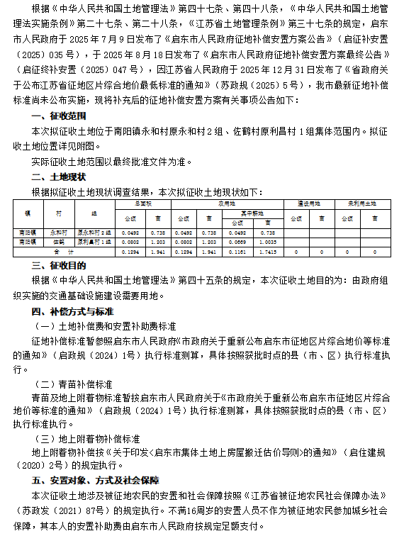 启东市人民政府征地补偿安置方案补充公告 启征补安置补告【2026】009号