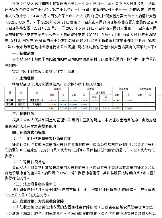启东市人民政府征地补偿安置方案补充公告 启征补安置补告【2026】008号