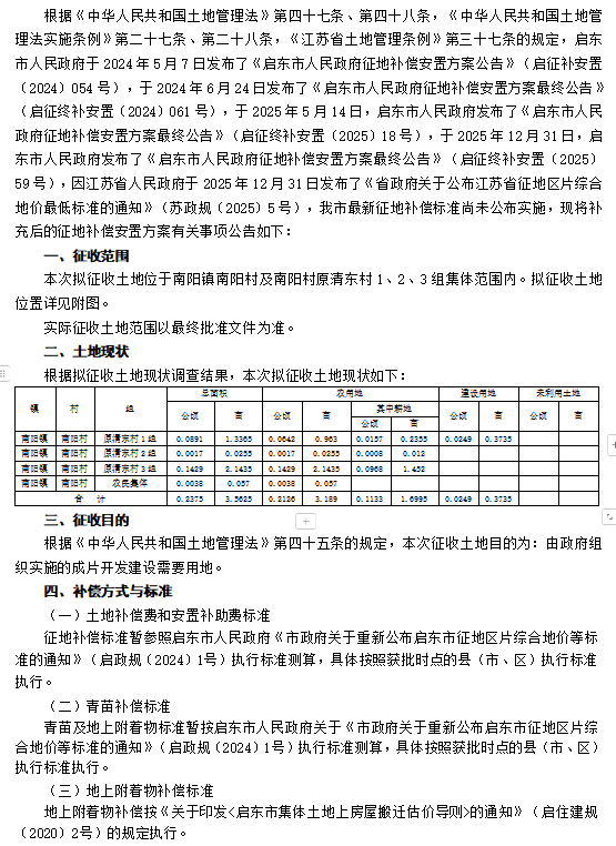 启东市人民政府征地补偿安置方案补充公告 启征补安置补告【2026】007号