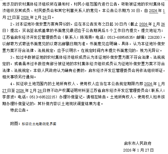 启东市人民政府征地补偿安置方案补充公告 启征补安置补告【2026】003号