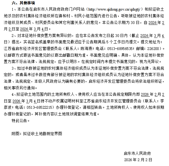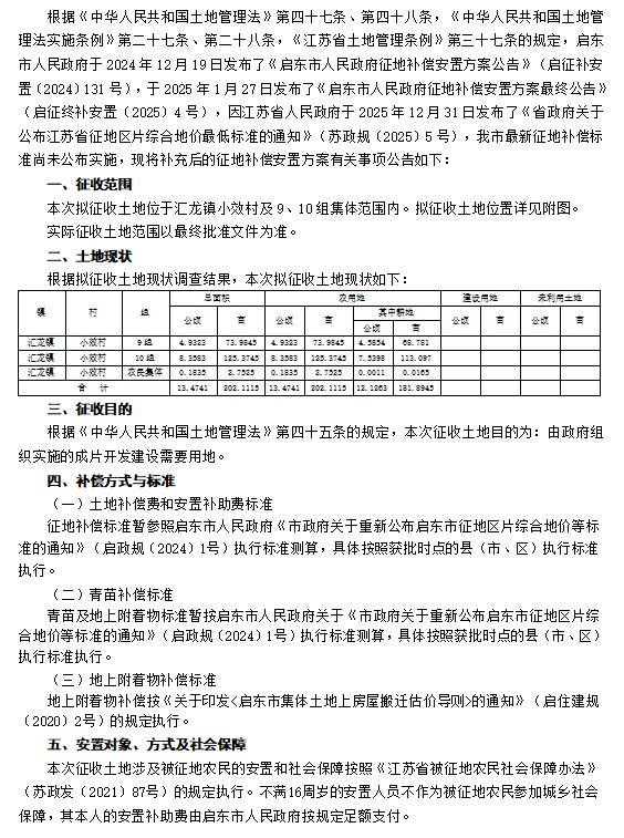 启东市人民政府征地补偿安置方案补充公告 启征补安置补告【2026】018号