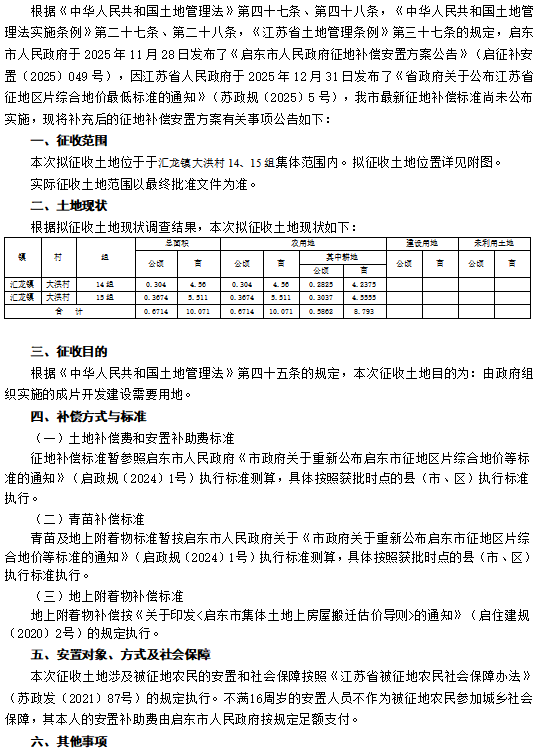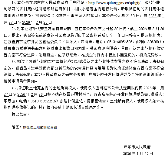 启东市人民政府征地补偿安置方案补充公告 启征补安置补告【2026】002号