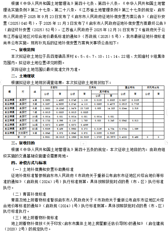 启东市人民政府征地补偿安置方案补充公告 启征补安置补告【2026】014号