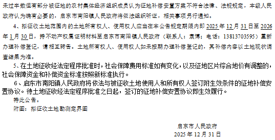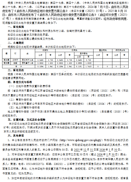 启东市人民政府征地补偿安置方案最终公告 启征终补安置[2025]58号