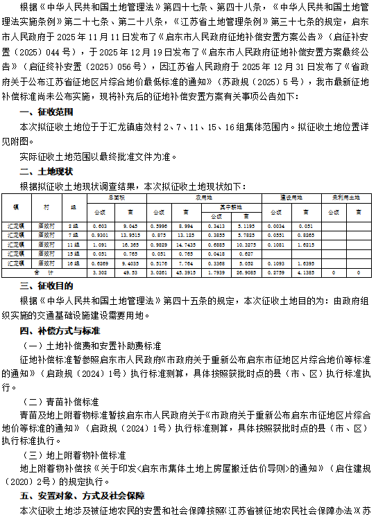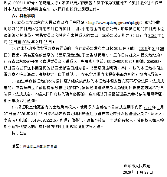 启东市人民政府征地补偿安置方案补充公告 启征补安置补告【2026】001号