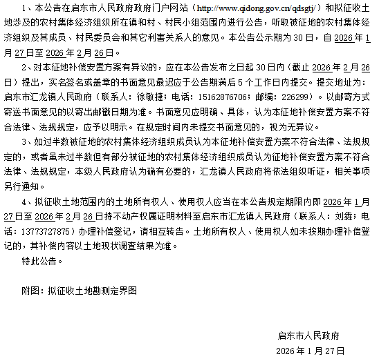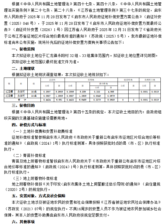 启东市人民政府征地补偿安置方案补充公告 启征补安置补告【2026】006号
