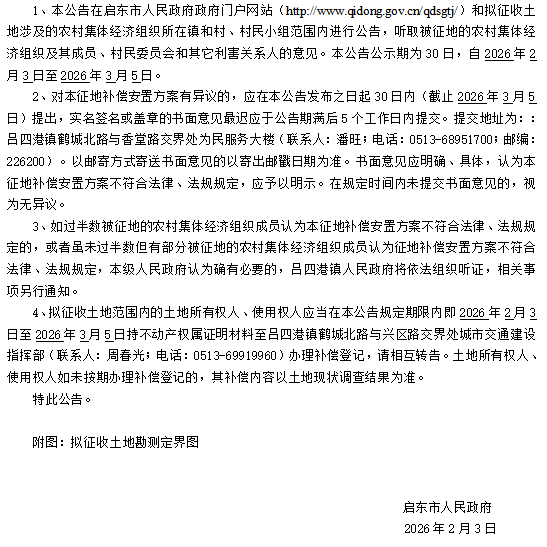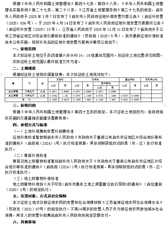 启东市人民政府征地补偿安置方案补充公告 启征补安置补告【2026】020号