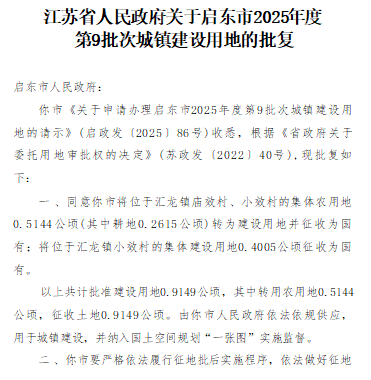 江苏省人民政府关于启东市2025年度第9批次城镇建设用地的批复苏政地F[2025]54号