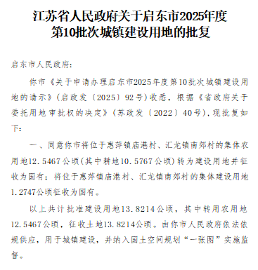 江苏省人民政府关于启东市2025年度第10批次城镇建设用地的批复苏政地F[2025]59号