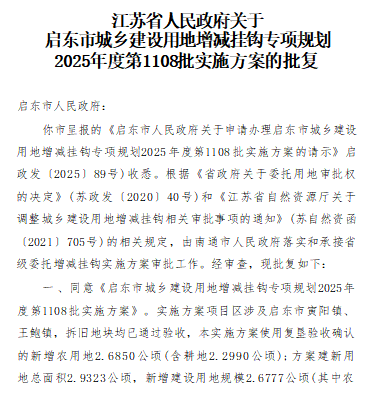 江苏省人民政府关于启东市城乡建设用地增减挂钩专项规划2025年度第1108批实施方案的批复 苏政挂F【2025】22号