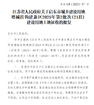 江苏省人民政府关于启东市城乡建设用地增减挂钩建新区2025年第2批次(21挂)建设用地土地征收的批复苏政地F(2025)37号